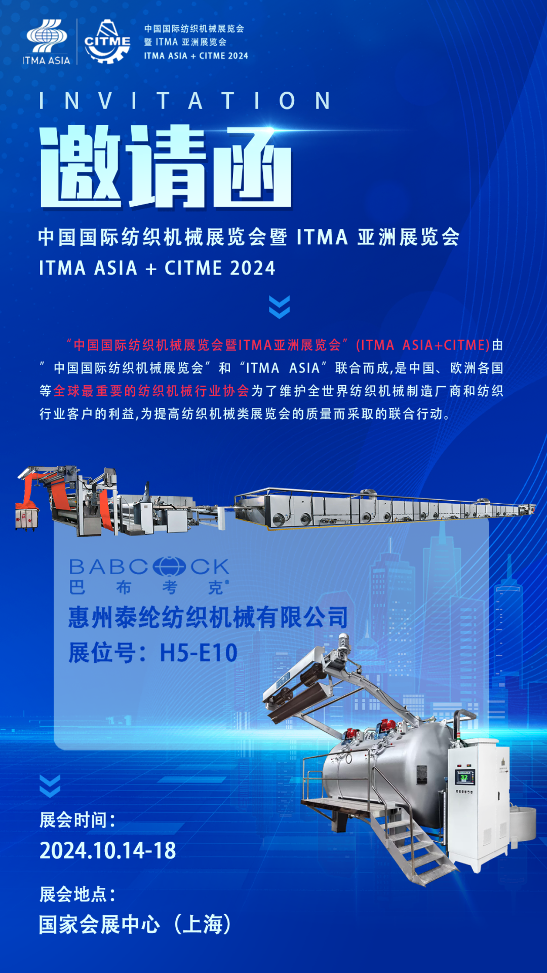 2024中国国际纺织机械展览会暨ITMA亚洲展览会,将于2024年10月14-18日在国家会展中心(上海)举办。届时,巴布考克将参加本次展会,展出旗下的产品。巴布考克诚邀各位朋友们莅临展位(H5-E10),现场来感受我们巴布考克染机和定型机的魅力,希望您能更加直观体会到我们的产品优势,欢迎来自世界各地的朋友来我们展位相互交流、共同进取,探讨染色发展之道!